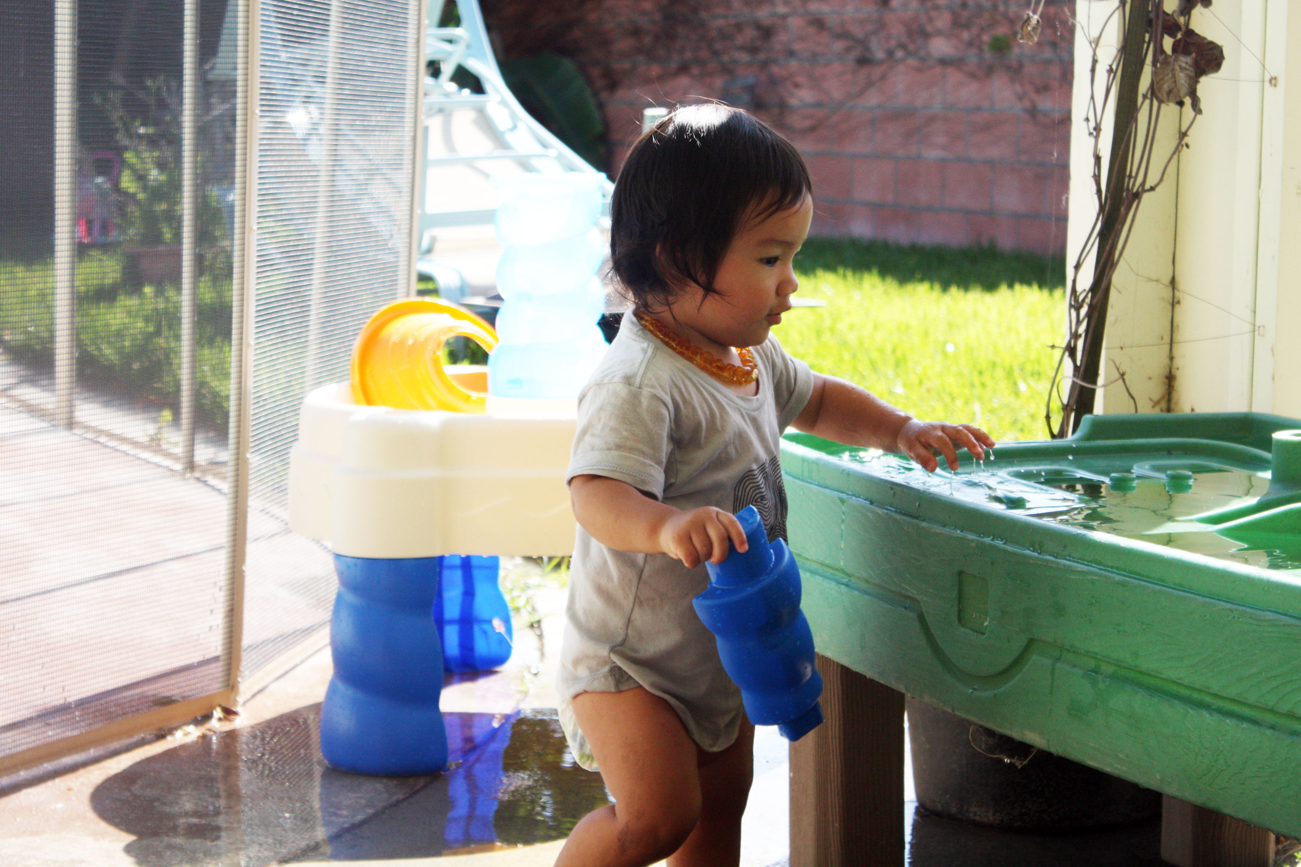 Afterwards, we headed home and took a much needed family nap! Luckily when we woke from our naps the weather was still warm and the sun was still shining bright so we decided to let Huntley play in the backyard for a bit with water tables and play set.