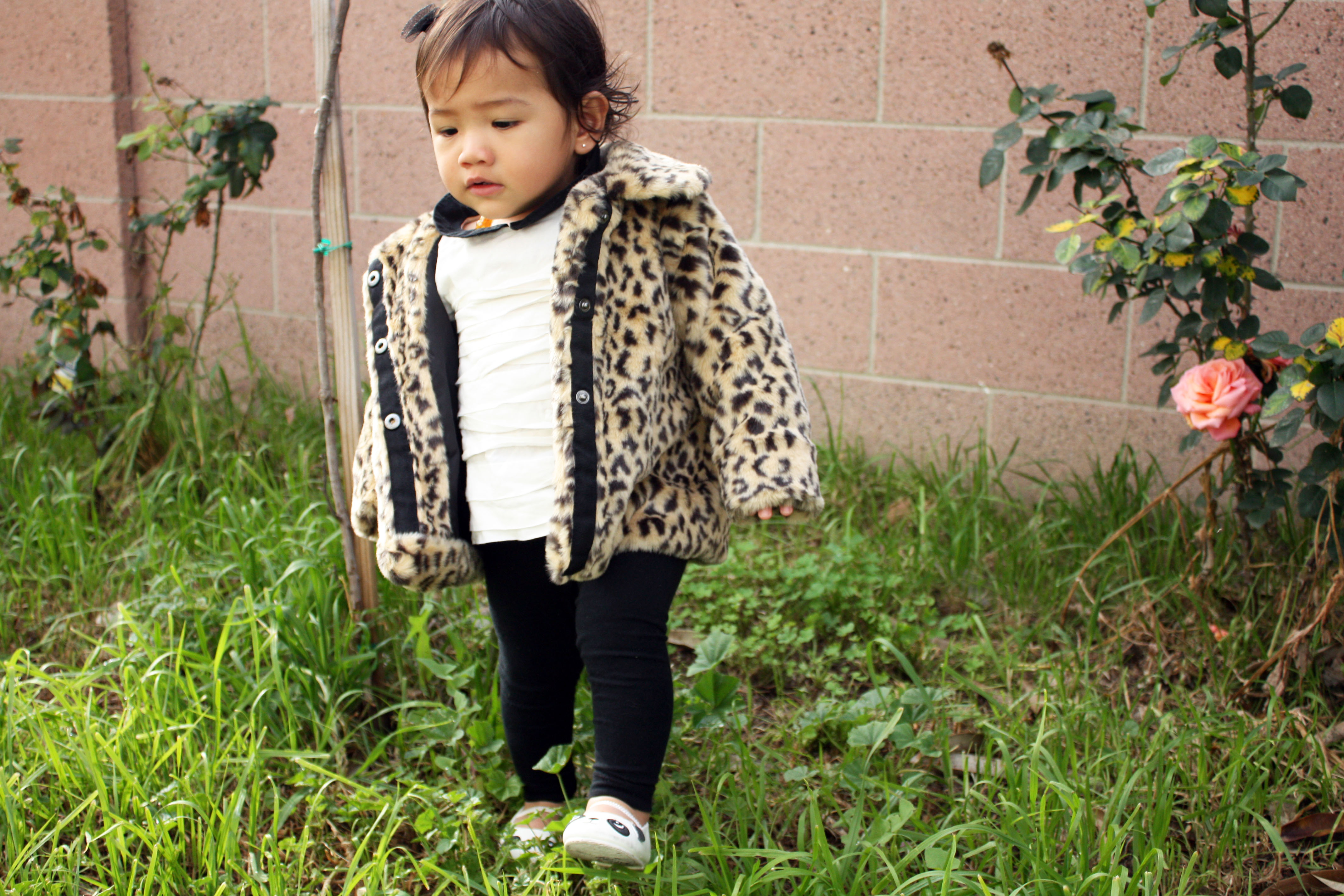 [Cherokee Leopard Print Coat (on sale now) I Gap Peter Pan Collar Blouse I Gap Black Leggings I H&M Panda Ballet Flats]