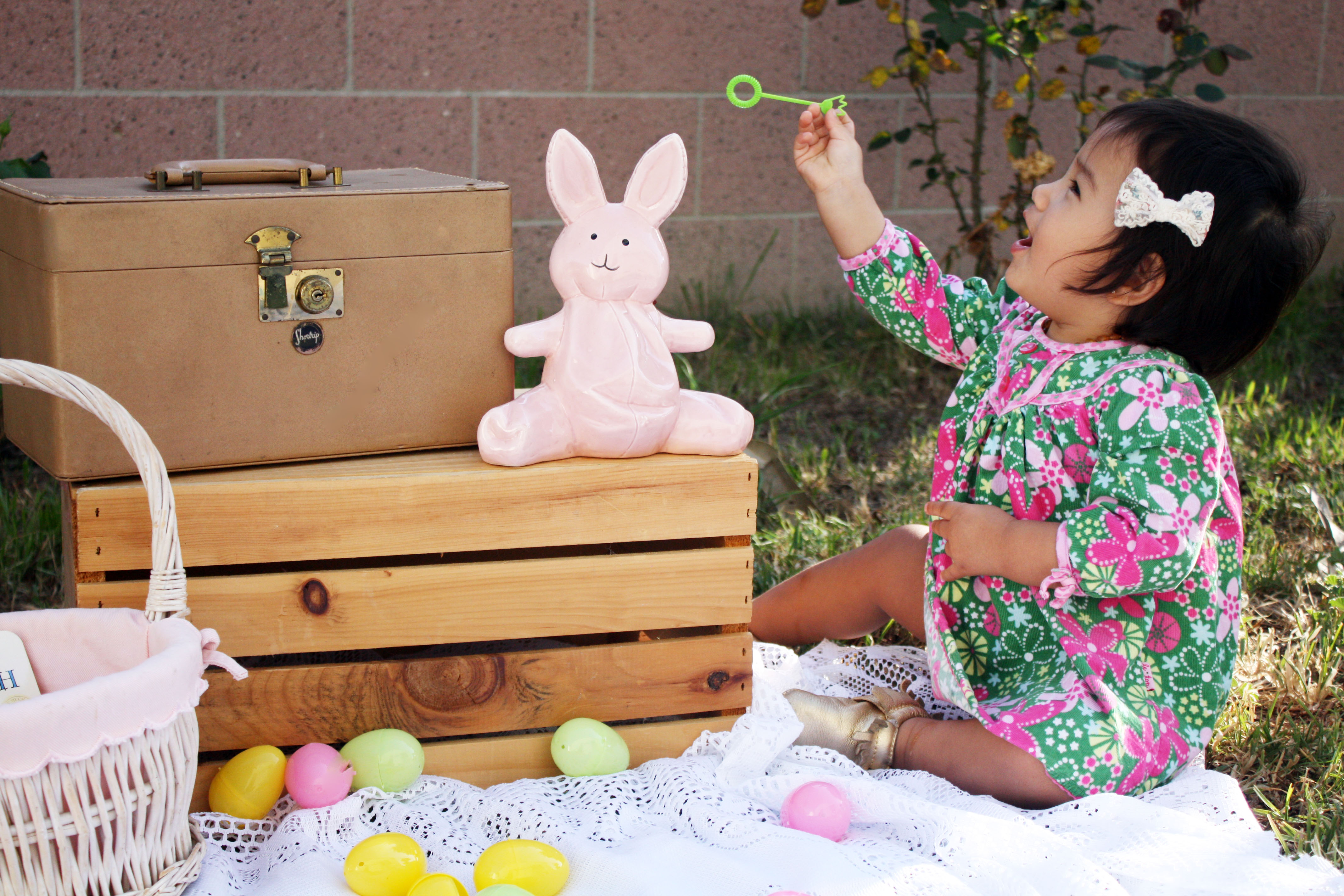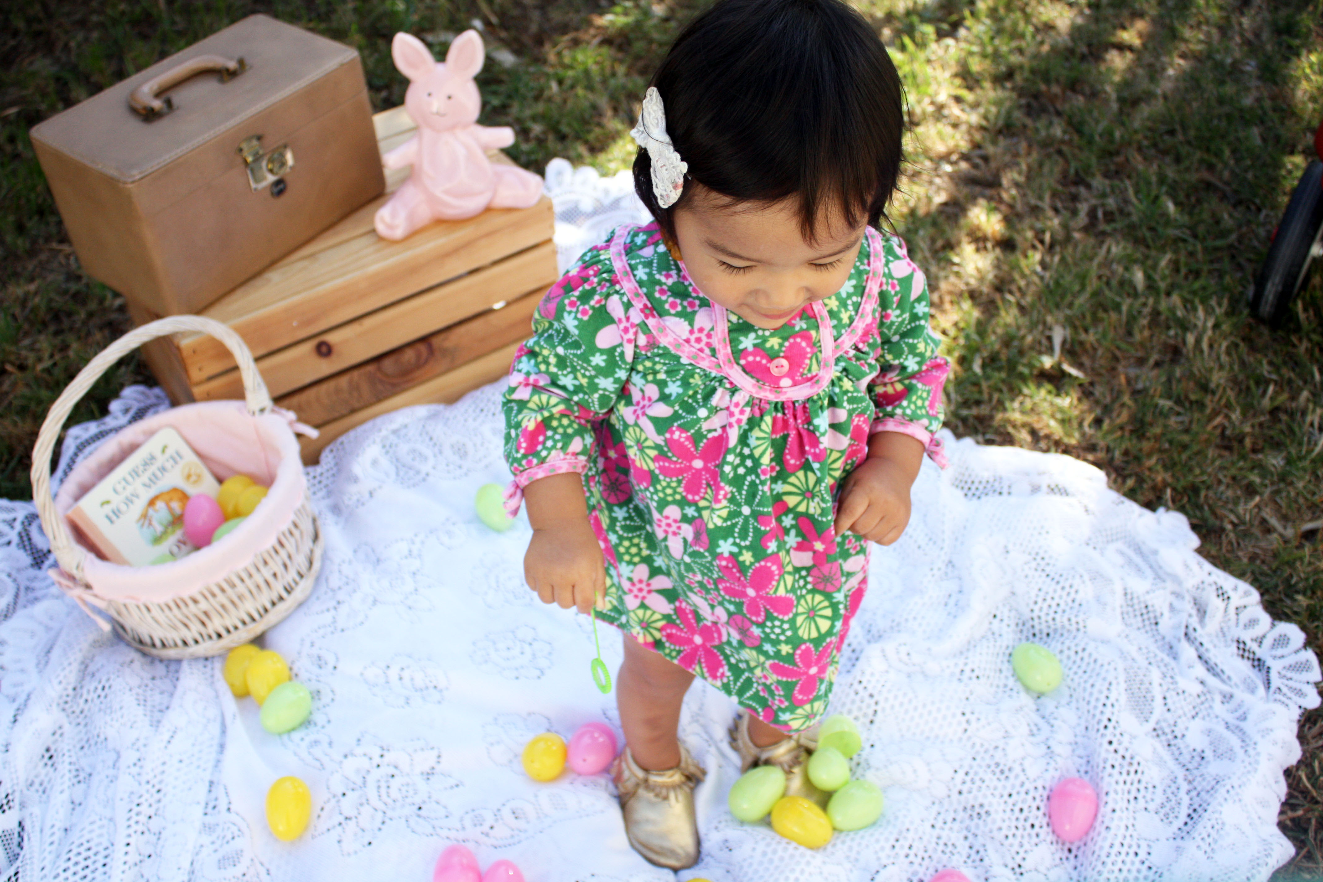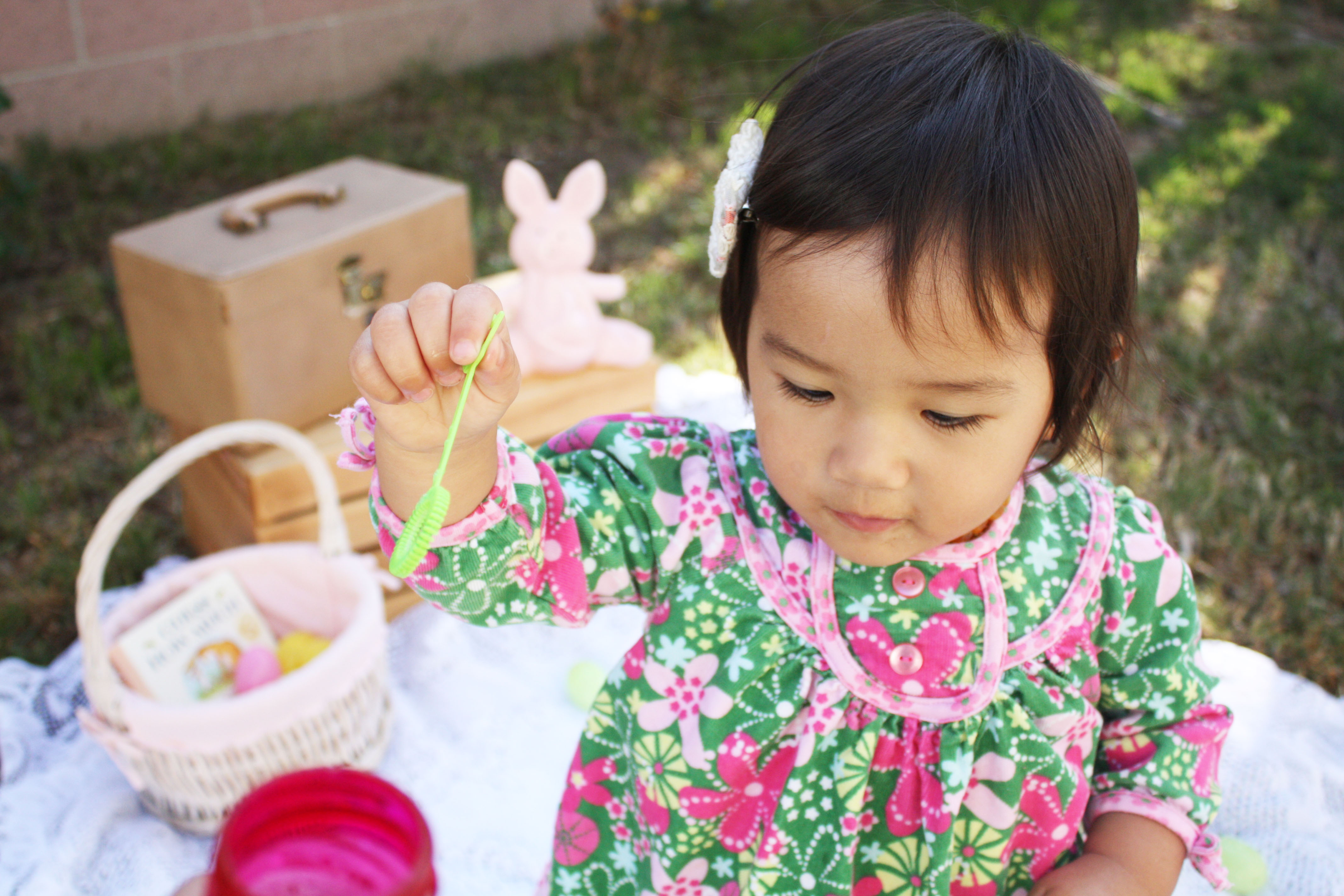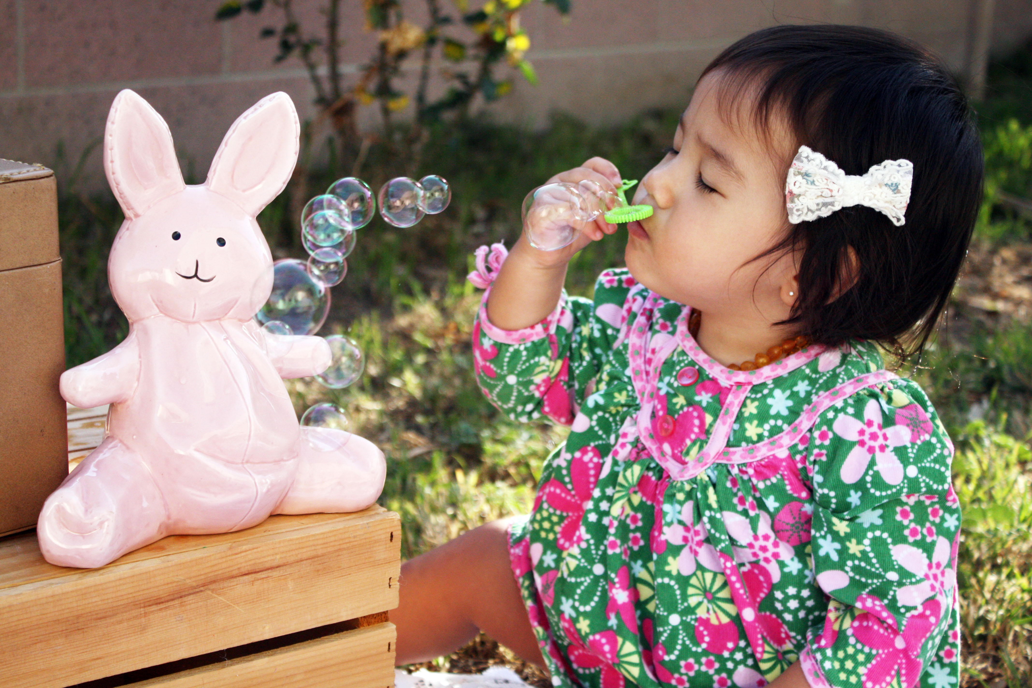 Since I still haven’t taken Huntley to see the mechanical interactive Easter Bunny at SCP, I decided to put her in the Le Top dress that she didn’t get to show off on St. Patrick’s Day and did a little impromptu Easter photo-shoot (in our backyard as always). Huntley had so much fun blowing bubbles and is getting quite good at it too!