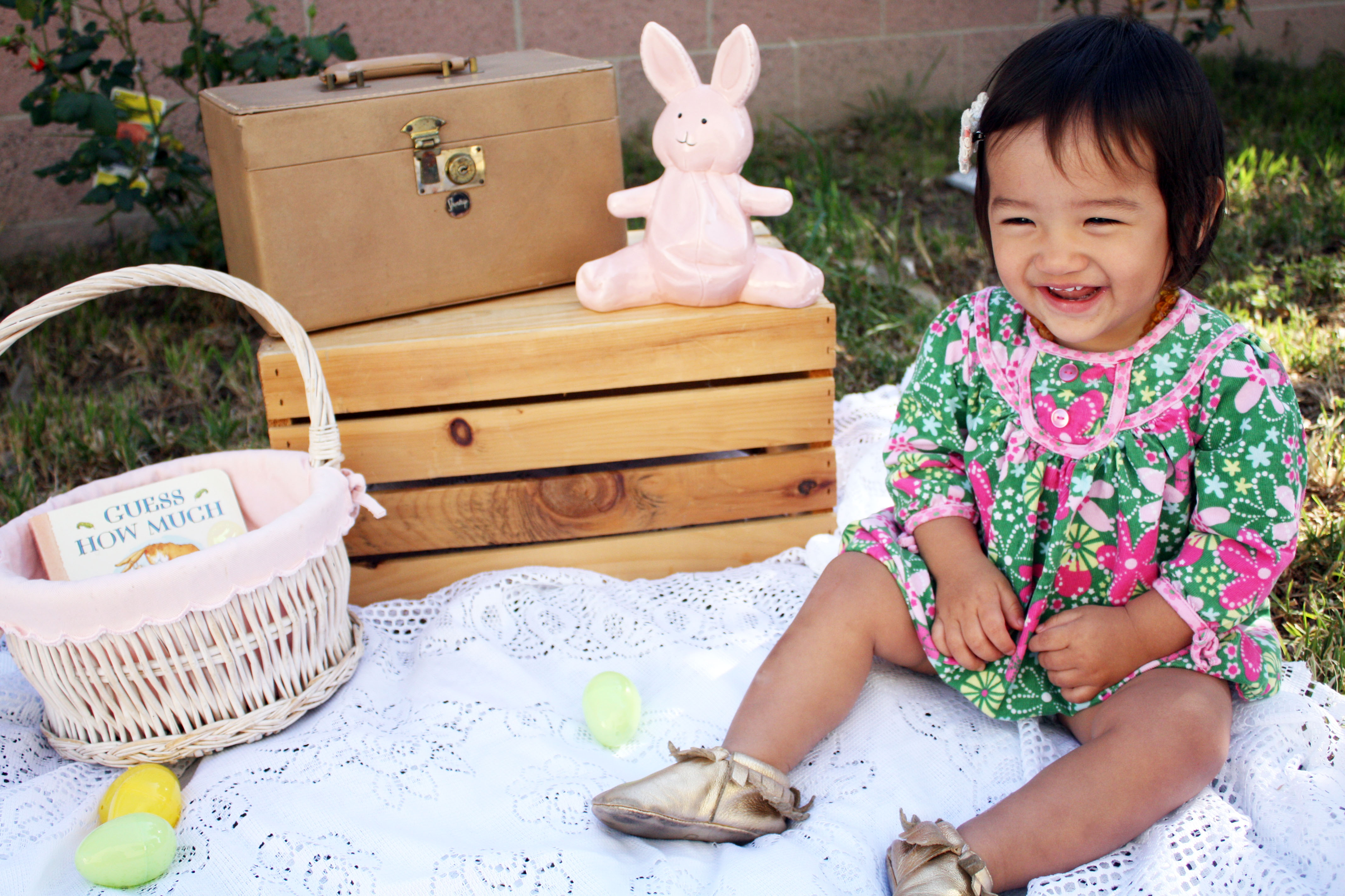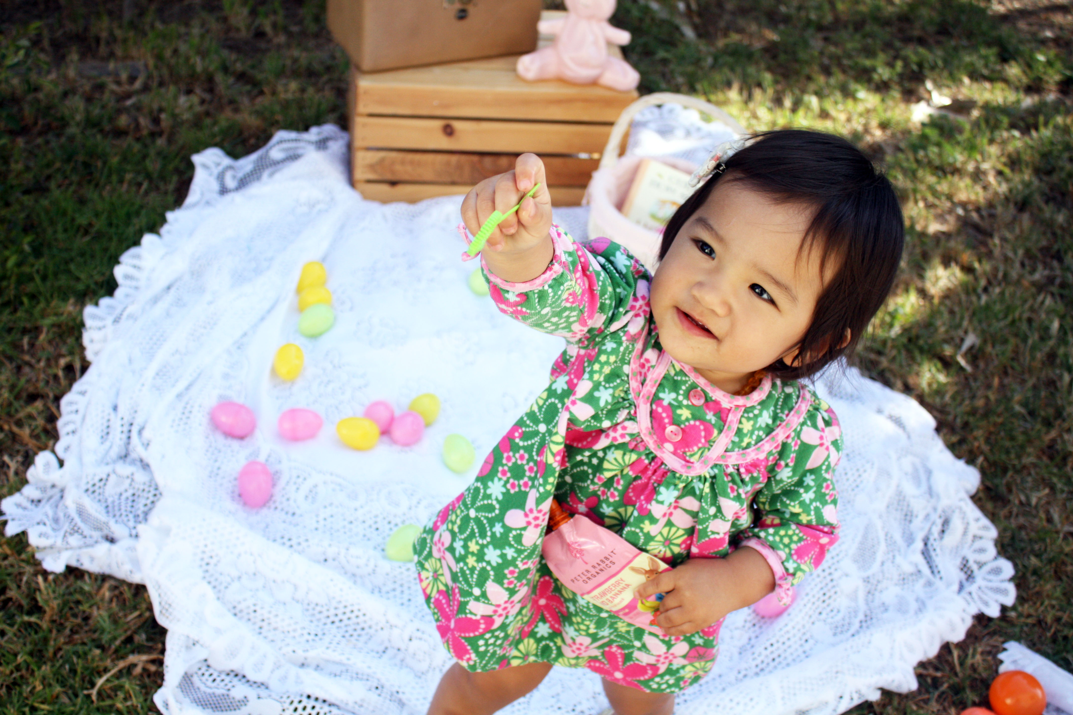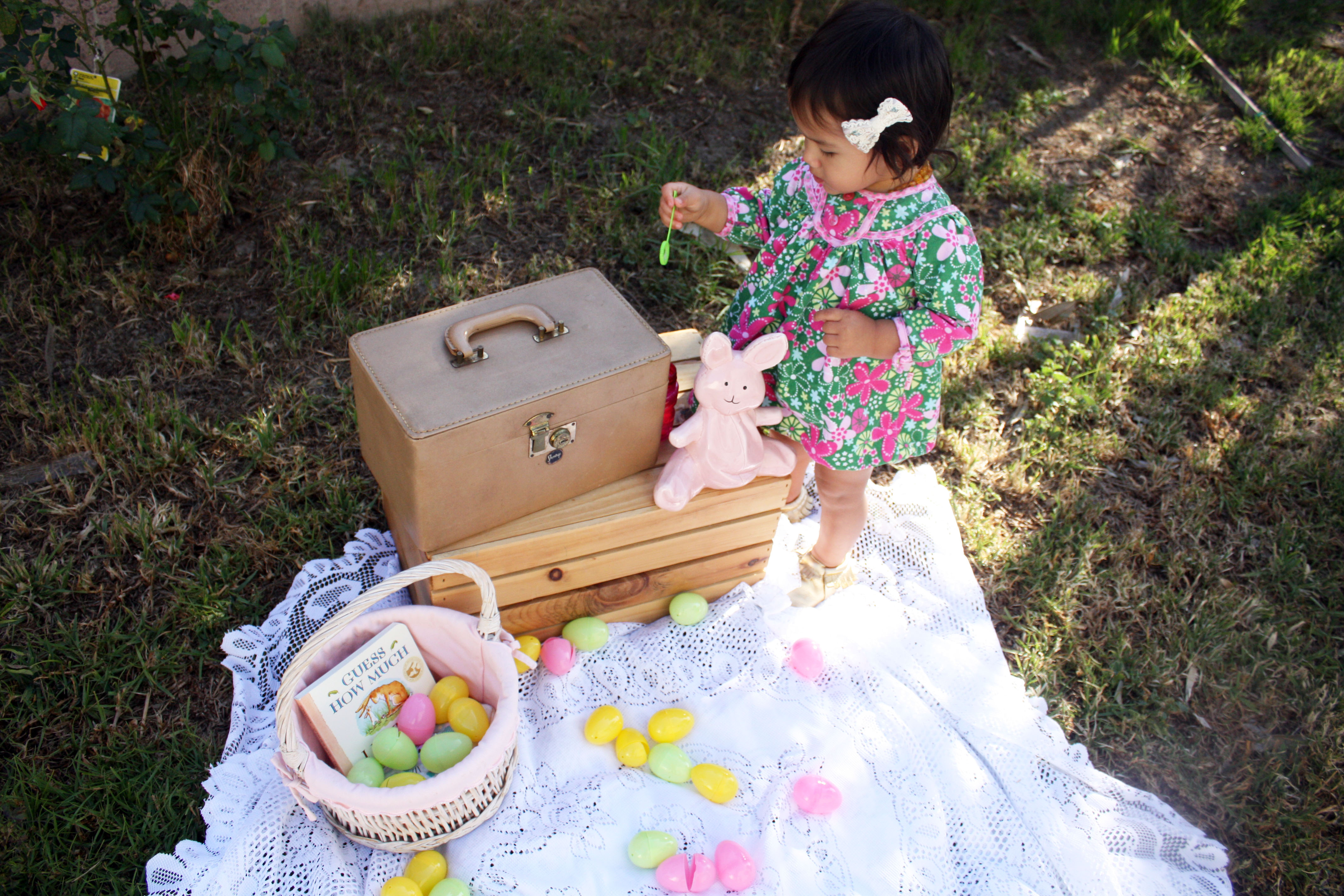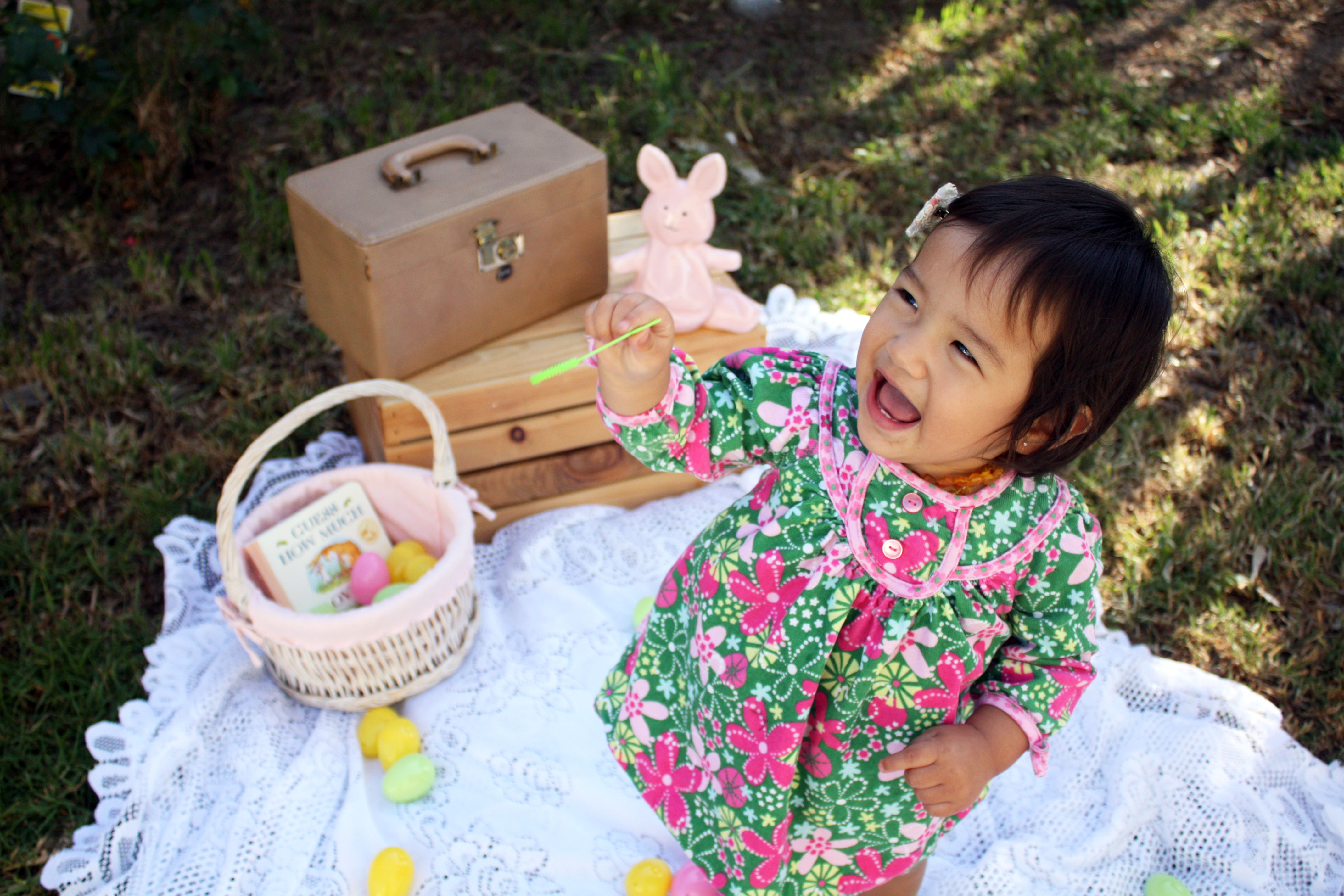 Since I still haven’t taken Huntley to see the mechanical interactive Easter Bunny at SCP, I decided to put her in the Le Top dress that she didn’t get to show off on St. Patrick’s Day and did a little impromptu Easter photo-shoot (in our backyard as always). Huntley had so much fun blowing bubbles and is getting quite good at it too!